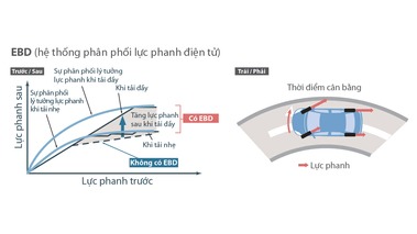Hệ thống phân phối lực phanh điện tử EBD phân bổ lực phanh hợp lý lên các bánh xe, giúp nâng cao hiệu quả phanh, đặc biệt khi xe đang chất tải và vào cua.
